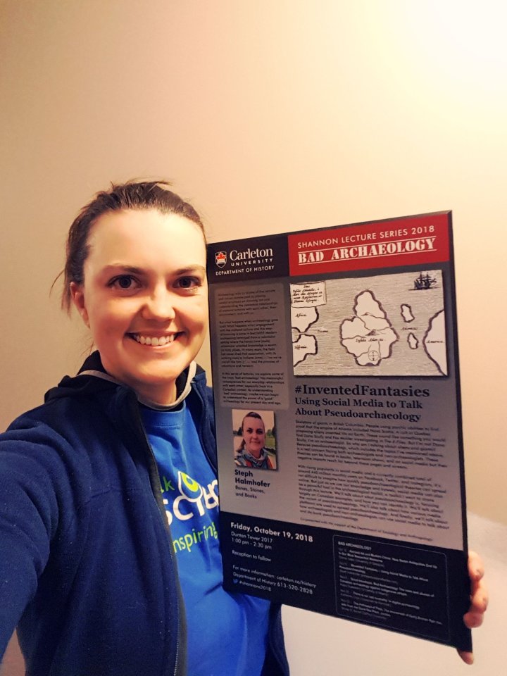 On October 19, 2018, I had the wonderful opportunity to give a public lecture at Carleton University in Ottawa, ON, as part of the 2018 Shannon Lecture series. This year’s theme is “Bad Archaeology”, organized by Dr. Shawn Graham. My lecture, entitled “#InventedFantasies: Using Social Media to Talk About Pseudoarchaeology”, covered a wide array of topics that I presented in a general manner with a non-archaeological audience in mind. The overall theme of the talk was communication – pseudoarchaeology is a real concern and archaeologists need to address this through improved communication. Pseudoarchaeology demonstrates that the public is interested in archaeology, but the problem is that they don’t have easy access to archaeology. Instead pseudoarchaeology is what they have the most access to through bookstores, TV shows, and websites. We as archaeologists need to improve our communication and open archaeology up. We need to bring ourselves out from behind expensive paywalls and jargon-filled conference talks. I used my experiences as a First Gen student to highlight the points I was trying to make and spoke about the need for archaeologists to become better communicators. To open ourselves and our field up and to share the knowledge we have and the tools we use for acquiring knowledge. I also spoke about how social media can be a useful tool for us to improve our communication. I didn’t get as detailed about the topic as what I easily could have, but I hoped to leave the audience with a general introduction and enough details to peak their curiosity to learn more. More importantly, I spoke with the goal of sharing knowledge – I wanted the audience to gain the tools they needed in order to be able to identify pseudoarchaeology themselves once they left that lecture room.